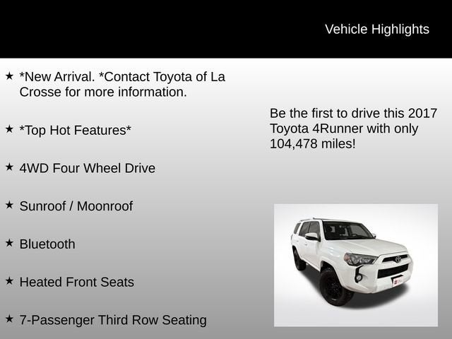 Discover the perfect balance of power, capability, and comfort with this 2017 Toyota 4Runner SR5 Premium. This exceptional SUV is ready to elevate your driving experience and take you on the adventures you crave. Boasting a robust 4.0L V6 engine and a 4WD drivetrain, this 4Runner is engineered to conquer any terrain with confidence. Enjoy the convenience of the 5-speed automatic transmission with overdrive, ensuring a smooth and efficient ride. Indulge in the premium features that set this SUV apart, including: 4WD Four Wheel Drive Sunroof / Moonroof Bluetooth® Heated Front Seats 7-Passenger Third Row Seating The 4Runner's impressive capabilities are complemented by a wealth of advanced technologies and safety features. Remote keyless entry, traction control, ABS brakes, and Electronic Stability Control provide peace of mind, while the Entune Premium Audio system with Navigation keeps you connected and entertained on the go. Step inside the spacious and well-appointed cabin, where you'll be surrounded by premium Softex synthetic leather seating, a leather-wrapped steering wheel, and a power driver's seat. The generous cargo capacity and split-folding rear seats offer the flexibility to accommodate your growing family or adventurous lifestyle. With its rugged good looks and exceptional off-road prowess, the 4Runner SR5 Premium is the perfect companion for your next outdoor expedition. Whether you're tackling challenging terrain or navigating the daily commute, this Toyota SUV will exceed your expectations. Experience the uncompromising performance and refined comfort of the 2017 Toyota 4Runner SR5 Premium. Contact us today to schedule a test drive and discover why this remarkable SUV should be your next vehicle.