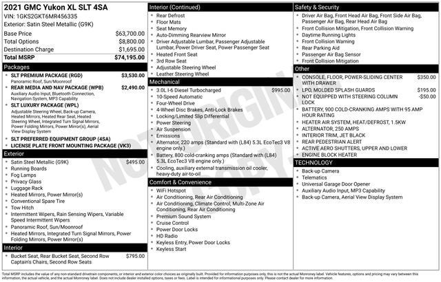 Experience the Pinnacle of Utility and Refinement with the 2021 GMC Yukon XL SLT Discover the perfect balance of spaciousness, capability, and premium features in the 2021 GMC Yukon XL SLT. This exceptional full-size SUV is the embodiment of versatility, designed to elevate your driving experience and accommodate your every need. Panoramic Sunroof/Moonroof Remote Start Bluetooth® Apple CarPlay Android Auto Heated Steering Wheel Heated and Ventilated Front Seats Heated Second Row Seats Blind Spot Monitoring 1-Owner, Clean CARFAX with No Accidents or Title Issues The Yukon XL SLT's powerful 3.0L I6 Diesel Turbocharged engine, paired with a smooth-shifting 10-speed automatic transmission, delivers exceptional performance and efficiency, with an impressive 26 MPG on the highway. Equipped with 4-Wheel Drive, this SUV is ready to tackle any terrain with confidence. Indulge in the luxurious interior, featuring premium leather seating, a 10.2-inch diagonal GMC Infotainment System with Navigation, and a Bose 9-speaker audio system. The Rear Seat Media System and Panoramic Power Sunroof enhance the overall driving experience, while the Hands-Free Power Programmable Rear Liftgate and Power-Sliding Center Console provide unparalleled convenience. Safety is paramount in the Yukon XL SLT, with a suite of advanced driver-assistance technologies, including Automatic Emergency Braking, Forward Collision Alert, Lane Keep Assist with Lane Departure Warning, and Rear Cross Traffic Alert, ensuring you and your loved ones arrive at your destination with confidence. Experience the epitome of luxury, capability, and technology in the 2021 GMC Yukon XL SLT. This exceptional SUV is the perfect blend of power, comfort, and convenience, making it the ultimate choice for those seeking the ultimate in family-friendly transportation. Visit our showroom today and let us demonstrate how the Yukon XL SLT can elevate your driving experience.